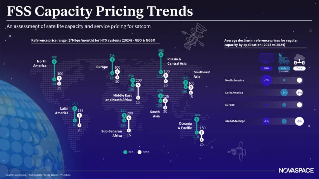 Paris, February 19, 2025 – Novaspace, the leading space consulting and market intelligence firm, has released the 7th edition of its FSS Capacity Pricing Trends report, analyzing the shift in satellite capacity pricing as the industry moves from scarcity to abundance. As new-generation satellites drive down costs, traditional wholesale leasing models are under increasing pressure. Operators are responding by adopting value-based pricing and innovative service models to remain competitive.